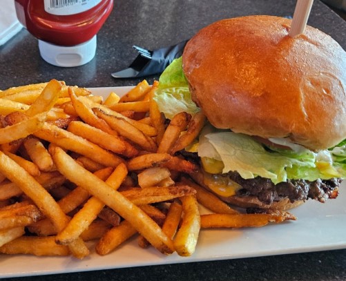 “This classic comfort food combo is hearty and satisfying. A juicy, 1/4 lb. beef patty topped with a slice of melted cheddar cheese, nestled in a sesame seed bun. Air fries can be upgraded to our irresistible Parmesan, Spicy Fries or Poutine.”