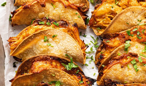 “These chicken and cheese mini tacos are bite-sized, crispy little pockets of flavor. The chicken brings savory, spiced notes—with hints of cumin, chili powder, & garlic—while the cheese adds a creamy, gooey richness that balances the texture. Served with sour cream and salsa. “Arriba, Arriba!””